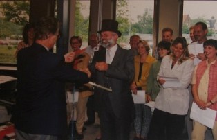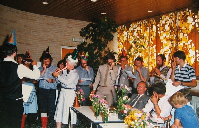 Rikus Veldkamp (Kassier) Jubileert met koor en orkest van de Boekhouding o.l.v. Flip Jonkman.