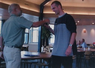 (eind 2001) Hij betaalde met f 100,- . Toen ik aanstalten maakte om wisselgeld op te halen zei Hij: 'Laat maar zitten, je hebt me